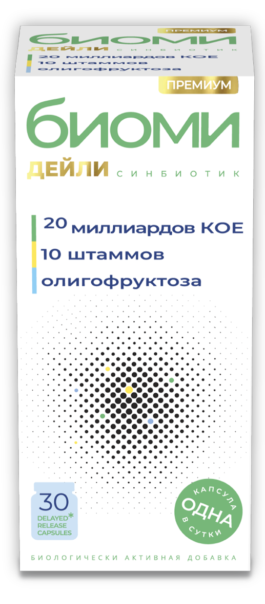 Биоми Дейли Премиум – это мультиштаммовая синбиотическая формула, состоящая из комбинации 10 штаммов полезных живых лиофилизированных бактерий и натуральных пищевых волокон (олигофруктозы), полученных из корня цикория. Биоми Дейли Премиум помогает нормальному пищеварению, усвоению питательных веществ и минералов, способствует укреплению иммунитета и активизации защитных функций организма. Полезные бактерии, входящие в состав Биоми Дейли Премиум, способны противодействовать болезнетворным микроорганизмам и поддерживать нормальную микрофлору кишечника во время и после перенесённых инфекций, отравлений, приёма антибиотиков. Кишечнорастворимые капсулы замедленного высвобождения (англ. delayed release, DR) устойчивы к воздействию кислоты желудочного сока, пищеварительных ферментов, желчи и обеспечивают безопасную доставку полезных бактерий и пищевых волокон в кишечник.